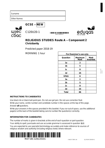 Eduqas Gcse Religious Studies Christianity Predicted Paper 2019 Past Paper Style Mark Scheme Teaching Resources